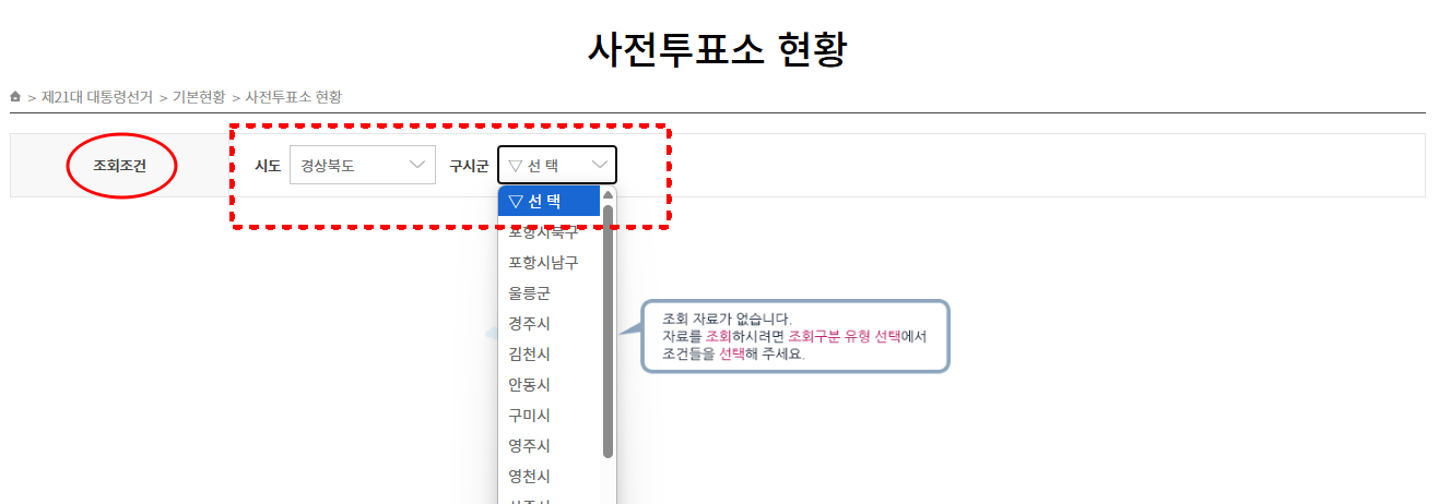 ※ 조회조건에서 경상북도 지정 후 해당 구시군 선택하여 검색